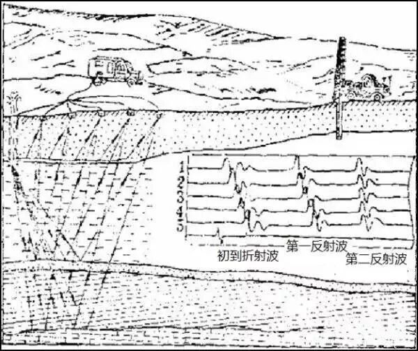 ? ? ? ?如上圖,在左邊地坑里面有一個爆炸造成人工地震,那輛汽車在進行多點測量。得到的訊號繪制在圖的右半邊。從中可以得到地下密度變化的三個地層。根據地震波的速度還能夠計算出層間的距離。圖的右邊有一輛車正在挖掘地坑,準備做下一次的人工地震。