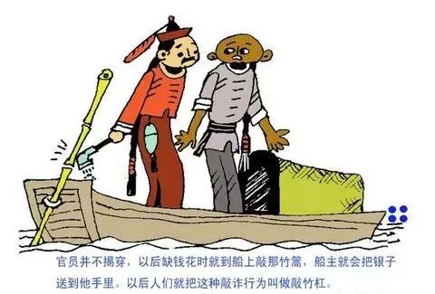 據說俗語“敲竹杠”,是來自海關的無損傷檢驗。海關人員為了檢查來船是否攜帶犯禁的鴉片,需要敲擊來船的竹篙或竹子。聽其聲音,看其中是否有違禁品。這和拍西瓜是一個道理。由于海關人員經常借機敲詐勒索,久而久之,“敲竹杠”便成為敲詐勒索轉義語了。